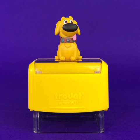 O Dug é esculpido com detalhes meticulosos, capturando sua essência divertida e carismática. O acabamento em tons vibrantes e o contraste com a base amarela do carimbo criam um visual atraente que se destaca em qualquer ambiente. Além disso, sua presença lúdica pode tornar tarefas cotidianas como carimbar documentos, etiquetas ou diários uma atividade muito mais agradável e mágica.