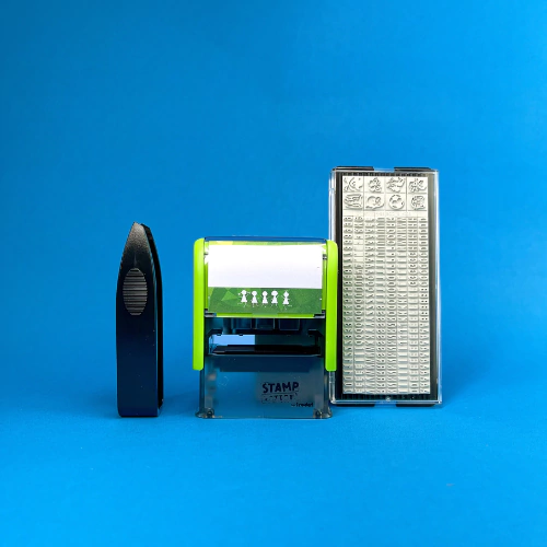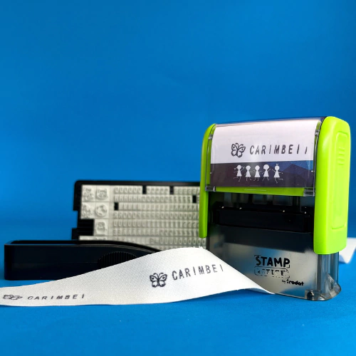 - Kit Completo: O conjunto inclui 01 carimbo, 01 refil de tinta têxtil preto, 01 placa com números, letras, algarismos e emojis para máxima personalização, 01 pinça para facilitar a montagem do texto, 01 cartela com 40 adesivos laváveis para fixação e 01 metro de fita transfer para criar etiquetas em tecidos escuros.