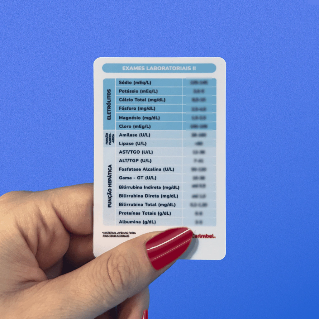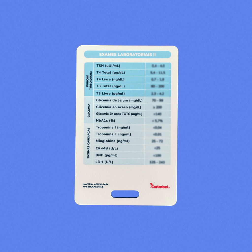 O CliniCard é um card de bolso com informações essenciais para quem atua na área da saúde. Com tamanho de cartão de crédito (8,5 x 5,5 cm), ele reúne de forma prática e organizada os principais Exames Laboratoriais, servindo como uma referência rápida no dia a dia clínico e acadêmico.